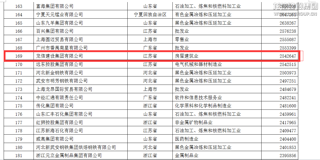 8月25日,由全國工商聯(lián)發(fā)布的“2015年中國民營企業(yè)500強”名單揭曉,龍信集團排名第169位,較2014年上升43位。